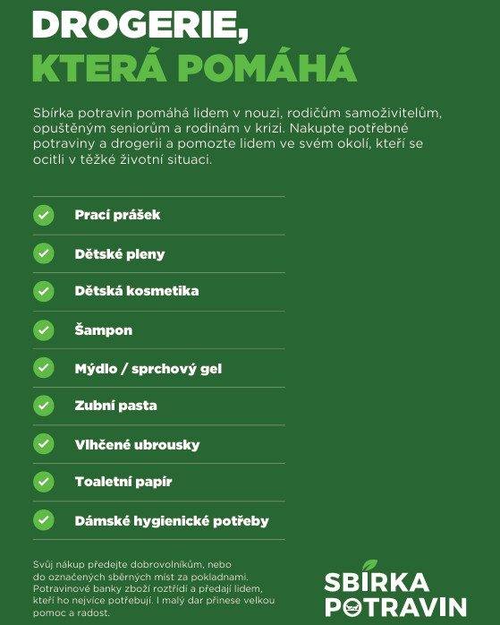 - drogerii (mýdlo, šampon, dětské plenky, prací prášek, hygienické potřeby aj.)