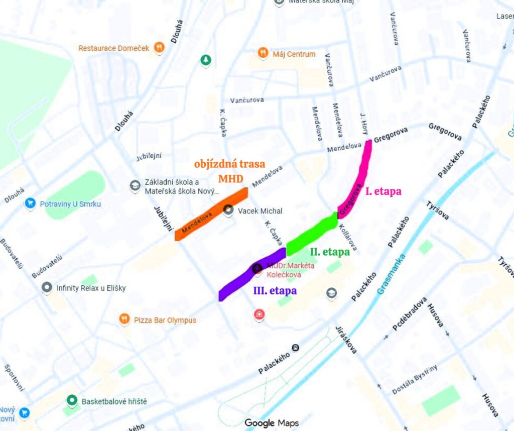 V první etapě, od 20. dubna do 30. června, bude ulice Gregorova zcela uzavřena v úseku od ulice Mendelova po ulici Kollárova. Následně od 1. července do 30. srpna dojde k úplné uzavírce v úseku od ulice Kollárova po ulici Karla Čapka. Třetí etapa, která potrvá od 31. srpna do 31. října, uzavře úsek od ulice Karla Čapka po ulici Jubilejní. V závěrečné etapě, od 2. listopadu do 15. listopadu, bude částečně omezen provoz v křižovatce ulic Gregorova a Jubilejní.